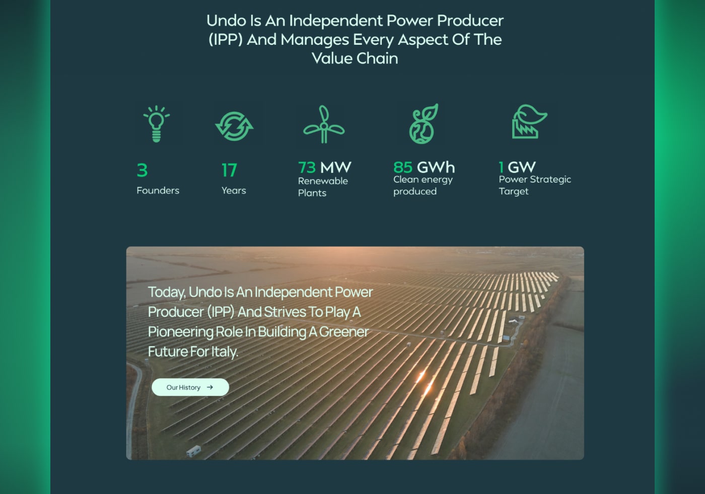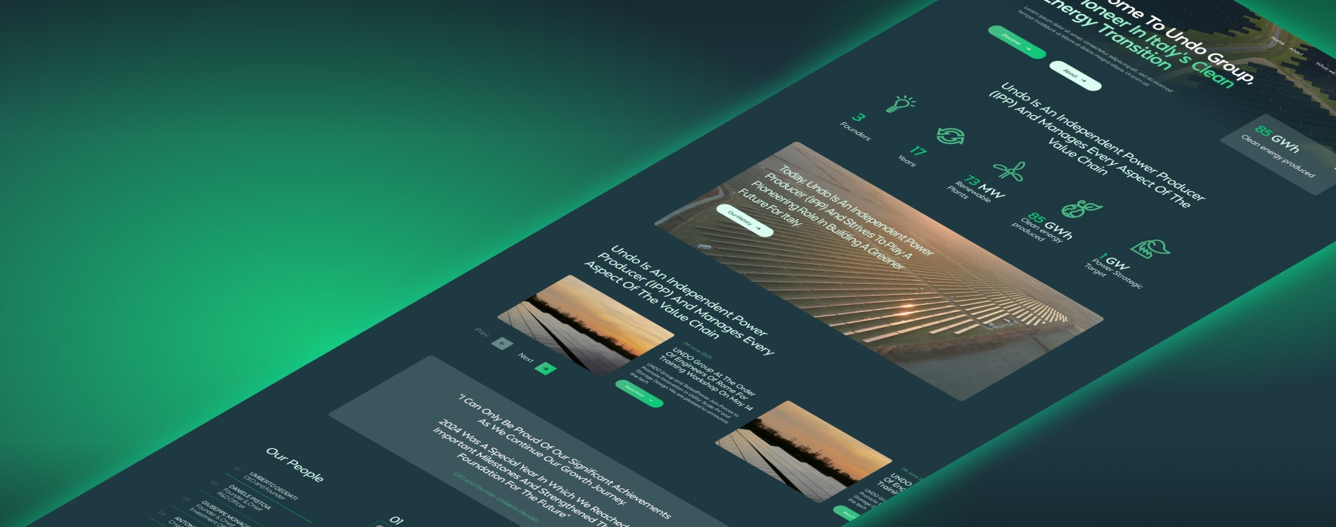 We created a professional Figma prototype for Undo Group, an independent power producer in Italy. The design reflects their focus on clean energy, credibility, and growth, providing a modern digital identity that communicates authority and trust.